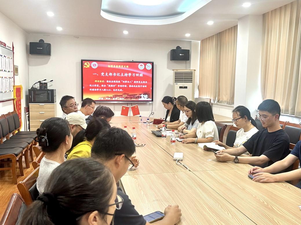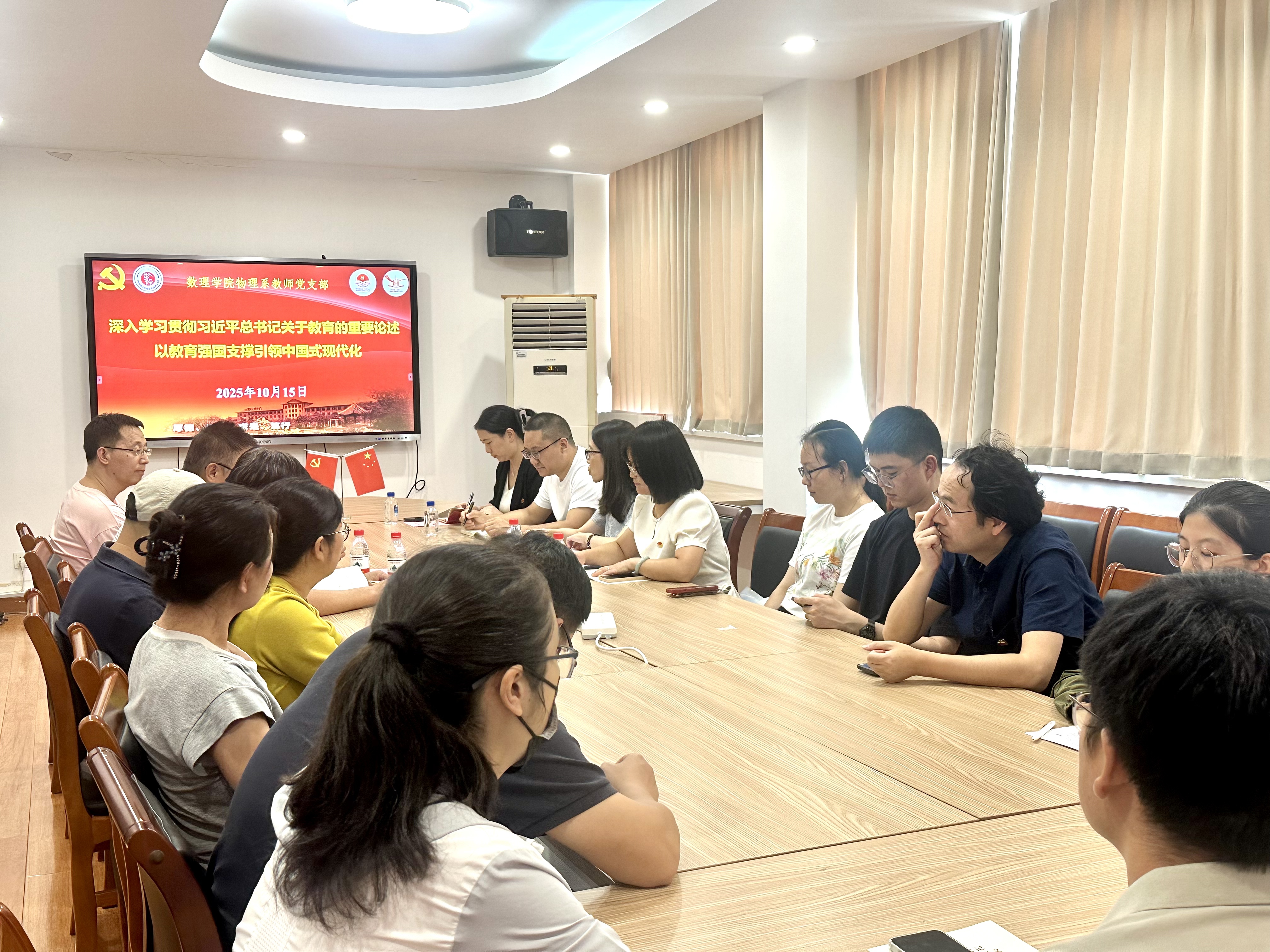 为深刻领会教育强国建设的战略意义,切实增强为党育人、为国育才的使命担当,2025年10月15日下午,上海师范大学数理学院物理系教师党支部在10号楼327会议室举行集中学习交流研讨。会议围绕教育部党组书记、部长怀进鹏同志主讲的“深入学习贯彻习近平总书记关于教育的重要论述 以教育强国支撑引领中国式现代化”视频专题报告展开深入学习与研讨。华东理工大学药学院药物科学系教工党支部副书记程侠卫老师、上海师范大学组织部党校张玲老师莅临指导。会议由党支部书记林方婷主持。