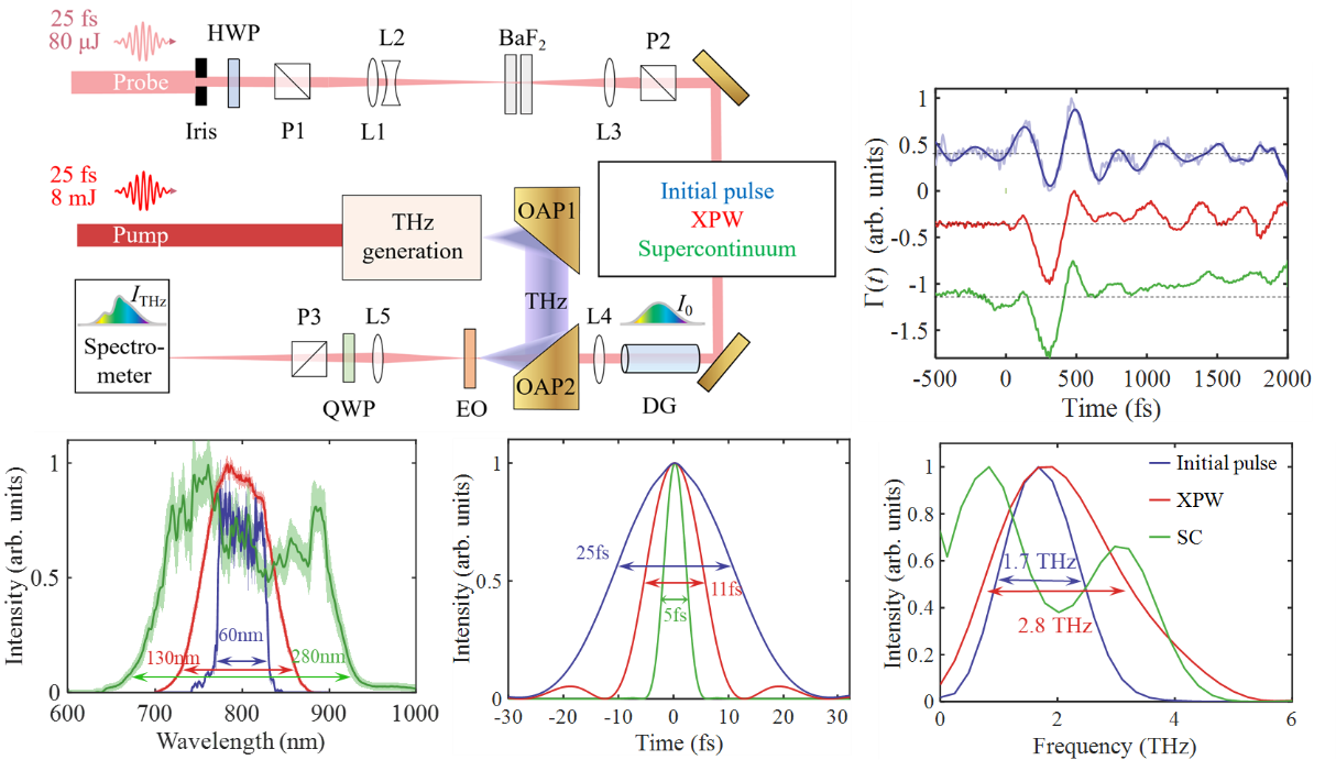 近日,我校数理学院刘建胜课题组提出了一种基于交叉偏振波(XPW)的改进型电光采样技术,实现了宽带太赫兹辐射的高时间分辨率、高信噪比单次相干探测。该研究通过双BaF₂晶体构型,显著优化了探测性能,系统测量带宽达2.8 THz,最高响应频率延伸至5 THz,为宽带太赫兹源表征和太赫兹时域光谱诊断提供了新的解决方案。该研究成果近期以“Modified spectral encoding for single-shot broadband terahertz detection based on cross-polarized wave”为题,于2026年3月17日在线发表于美国应用物理联合会权威期刊Applied Physics Letters,并被选为Editor's Pick。上海师范大学为唯一署名单位,数理学院毕业博士生王健硕和在读博士生焦旭辉为论文共同第一作者,秦志勇副研究员、余昌海副研究员以及刘建胜研究员为论文通讯作者。